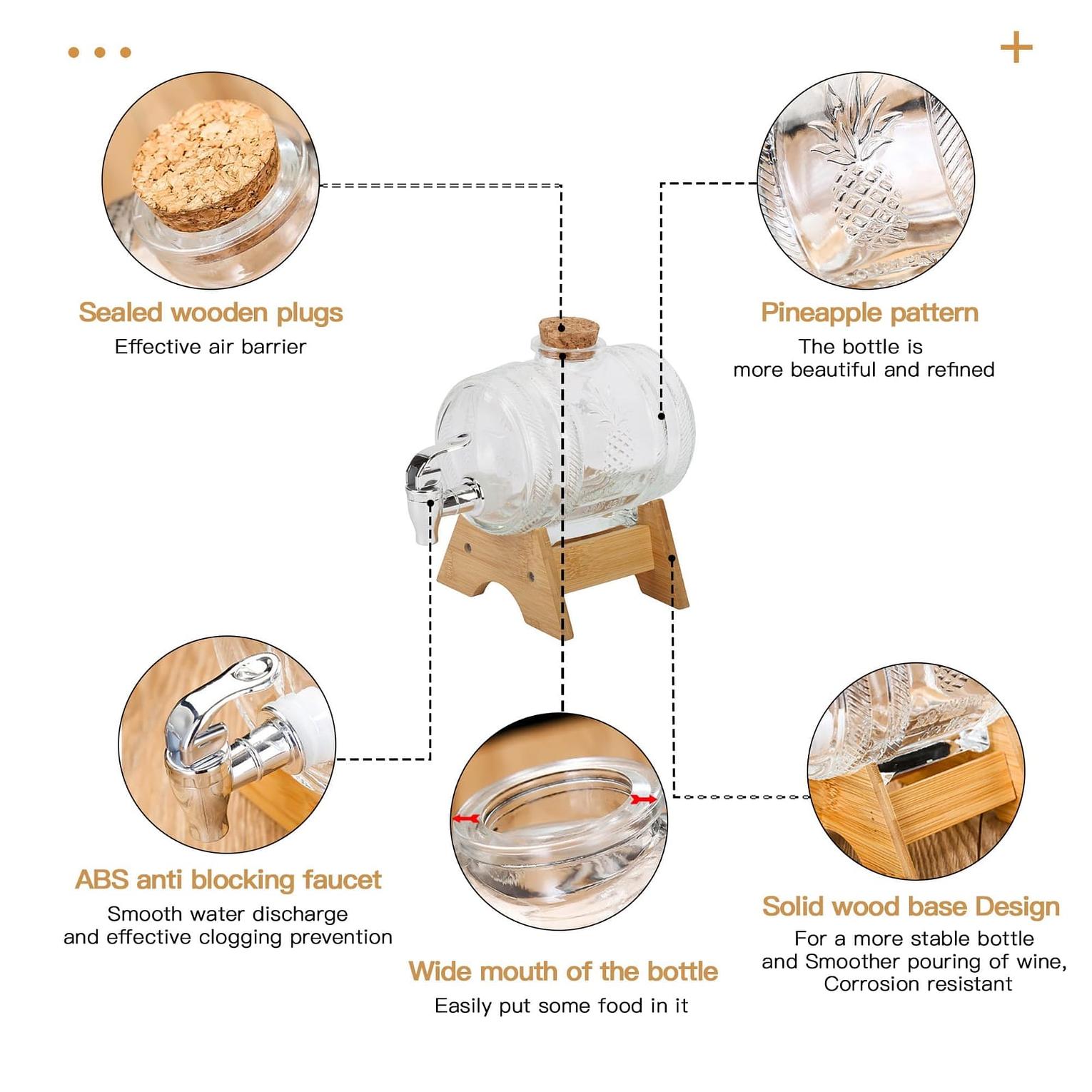 Wine barrel/dispenser perfect for use as a wine/juice or water dispenser. Glass material. Comes with a Wooden stand and lid Has a silver tap