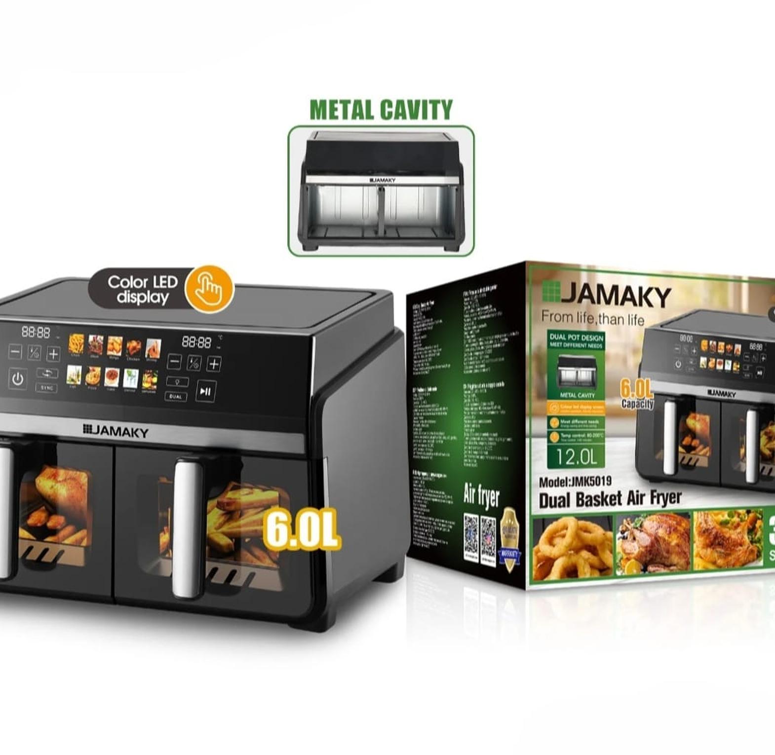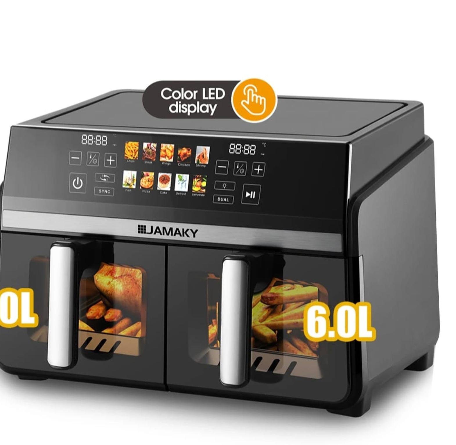 Dual Air fryer stack ✴️Capacity 6.0L + 6.0L ✴️Colour LED Display touch. ✴️Versatile & Time saving. ❇️Overheating protection.