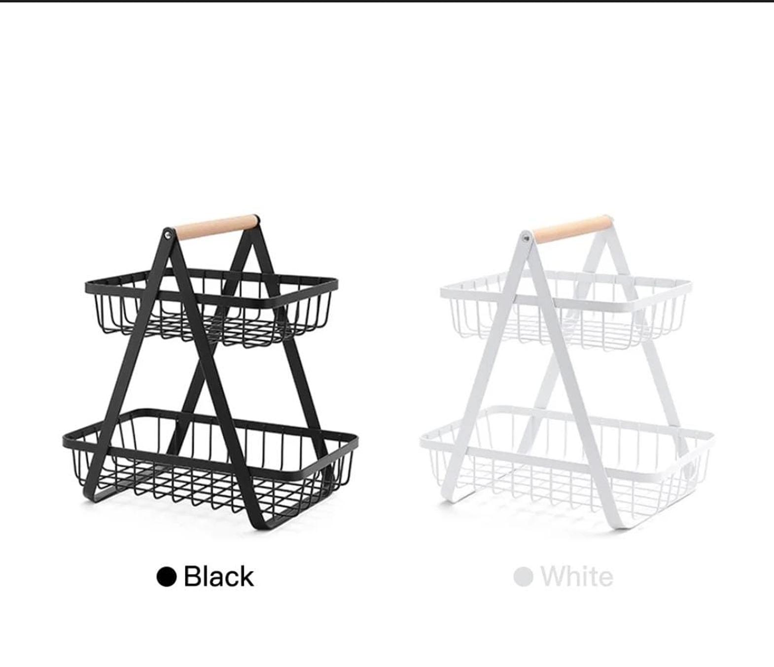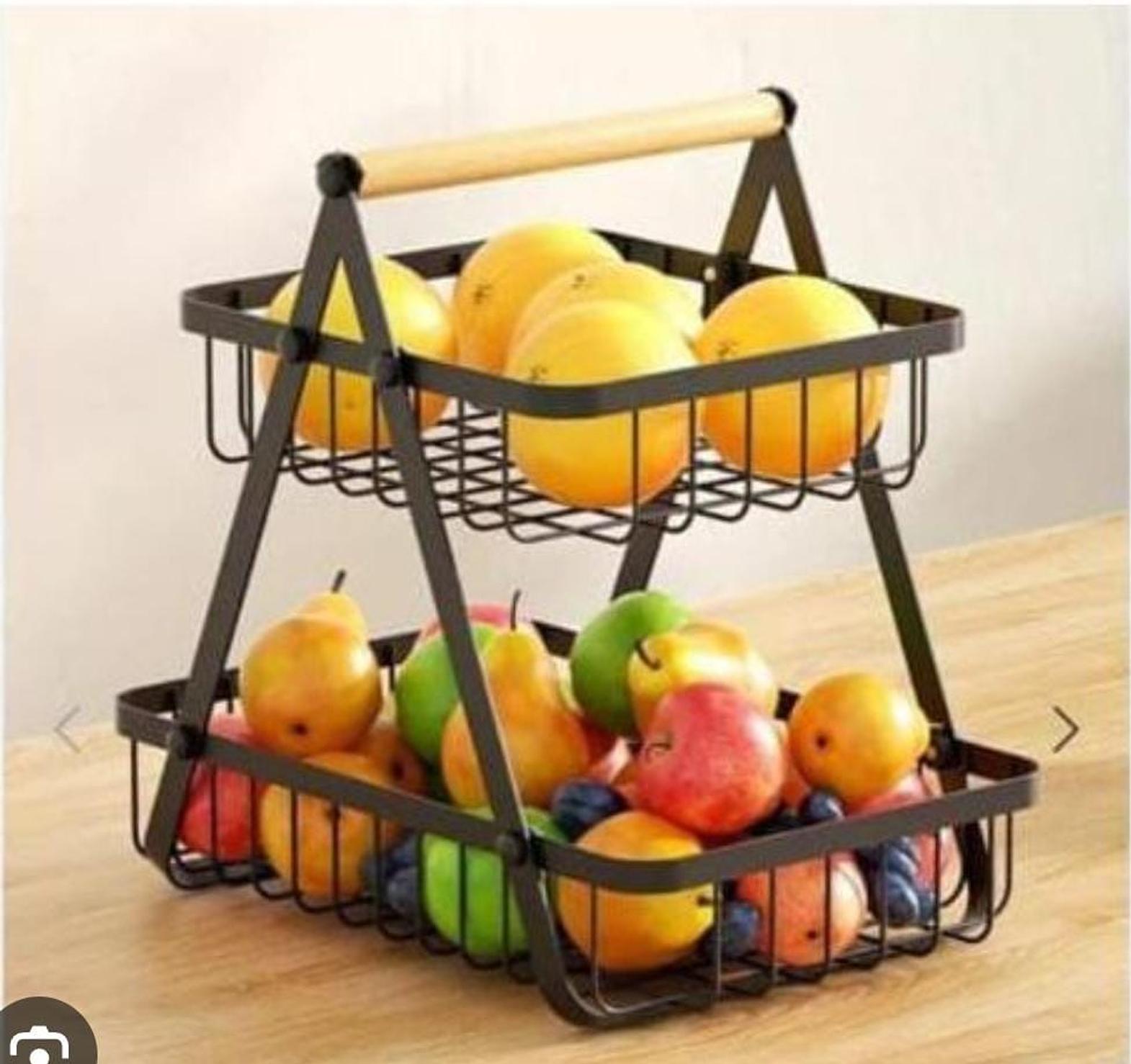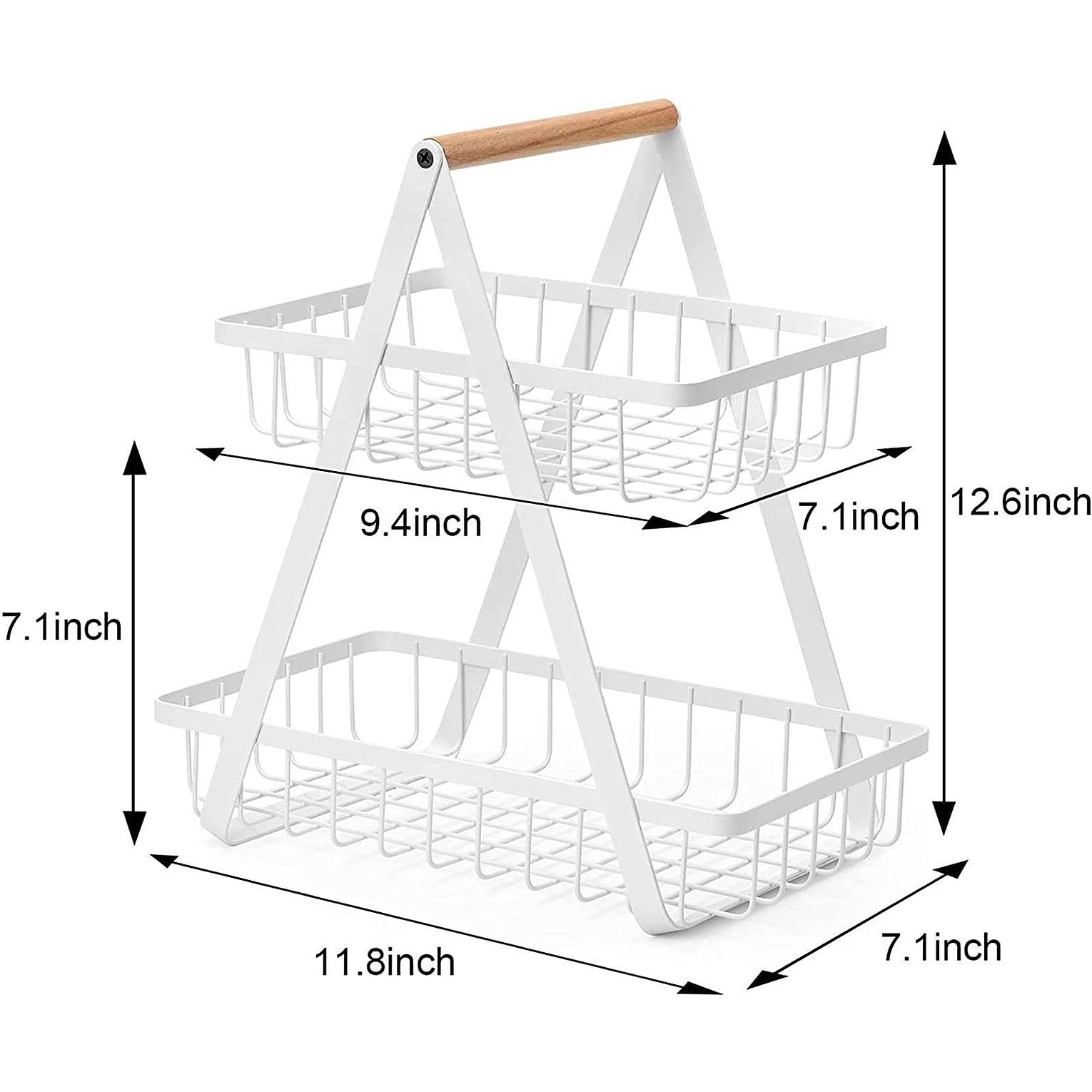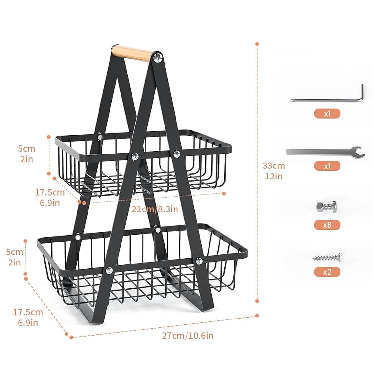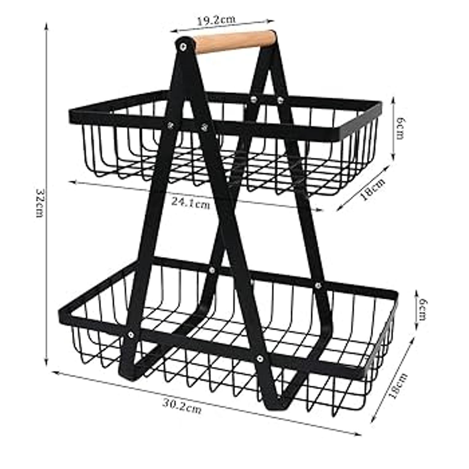Two-layer metal fruit storage basket Space-saving with large capacity Sturdy and rustproof construction Easy to assemble and stylish design Handmade with wrought iron for durability Versatile use for kitchen counters