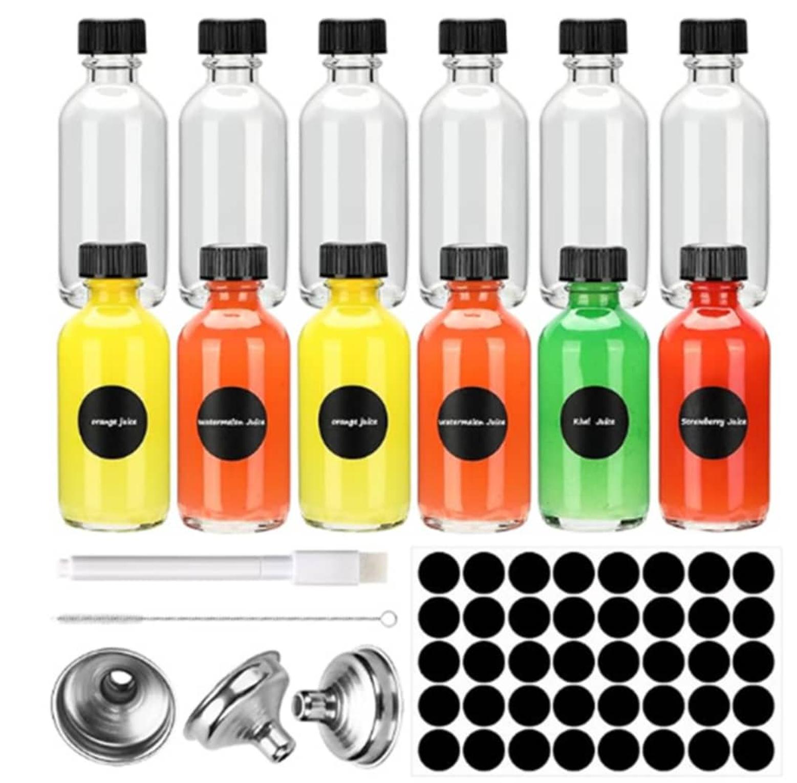 Ginger Shots Essential Glass Bottles ✴️Wellness Shot / Immunity Boosting Shots. ❇️Material - Glass Bottles with Air tight plastic lids [ Leak proff ] ❇️Capacity- 60 ML per bottle. A set of 12 contains: ⏺️ 12 Glass Bottles + ⏺️ 3 stainless steel funnels ⏺️1 pen +1 brush ⏺️1 black round sticker. 40 stickers in total