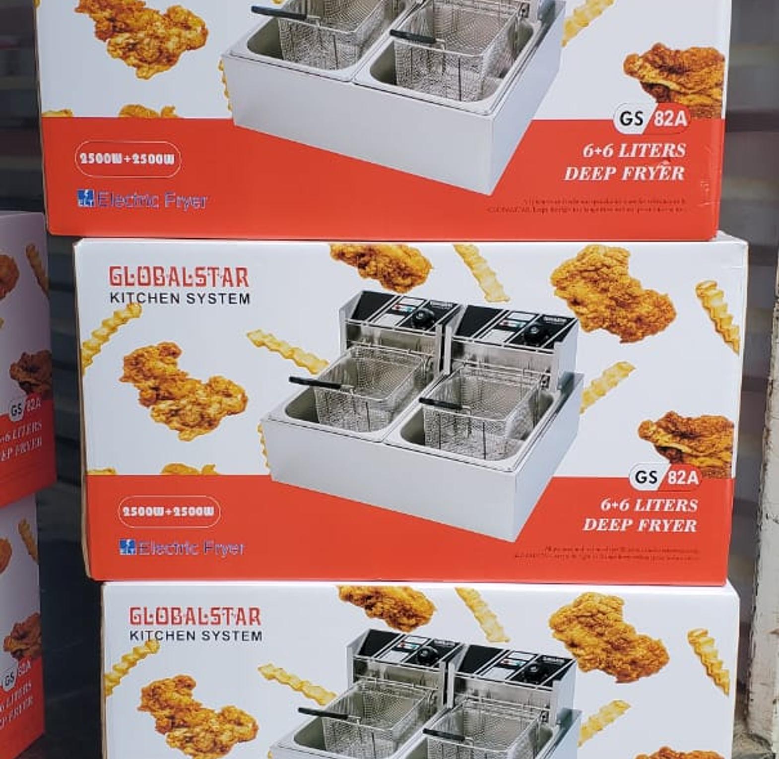 Stainless steel deep fryer for quick & simple frying Tank capacity: 6L+6L Adjustable temperature control Simple and easy to use Input: 220v/50Hz Usage: Home/Commercial Power: 2500W