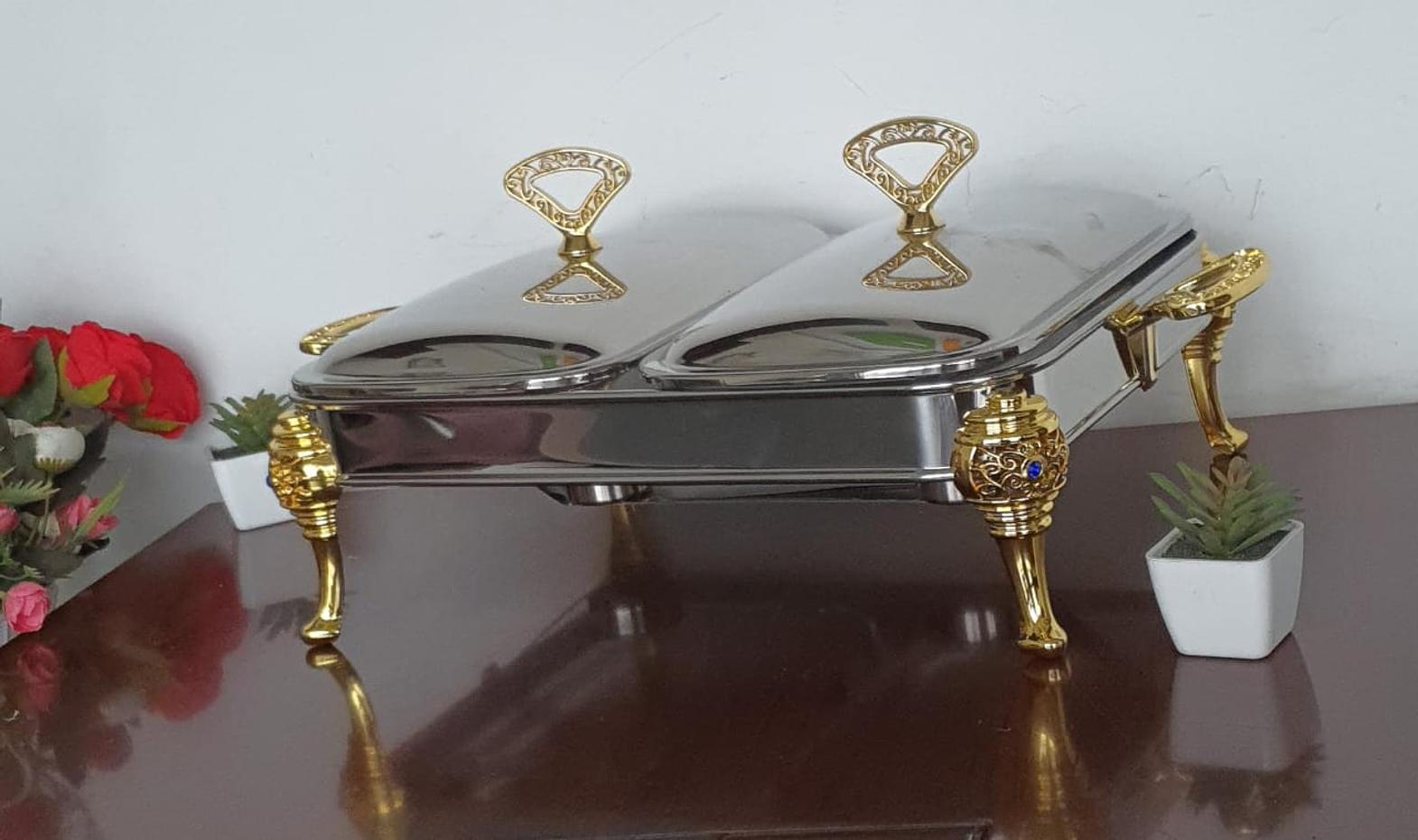 glass bowls; stainless steel cover with golden parts; fixed double burner