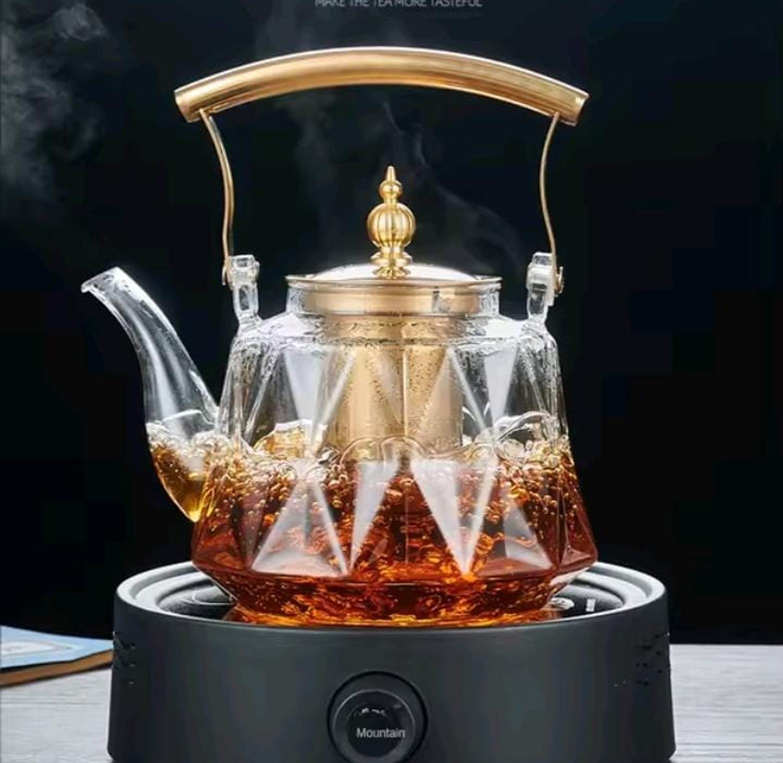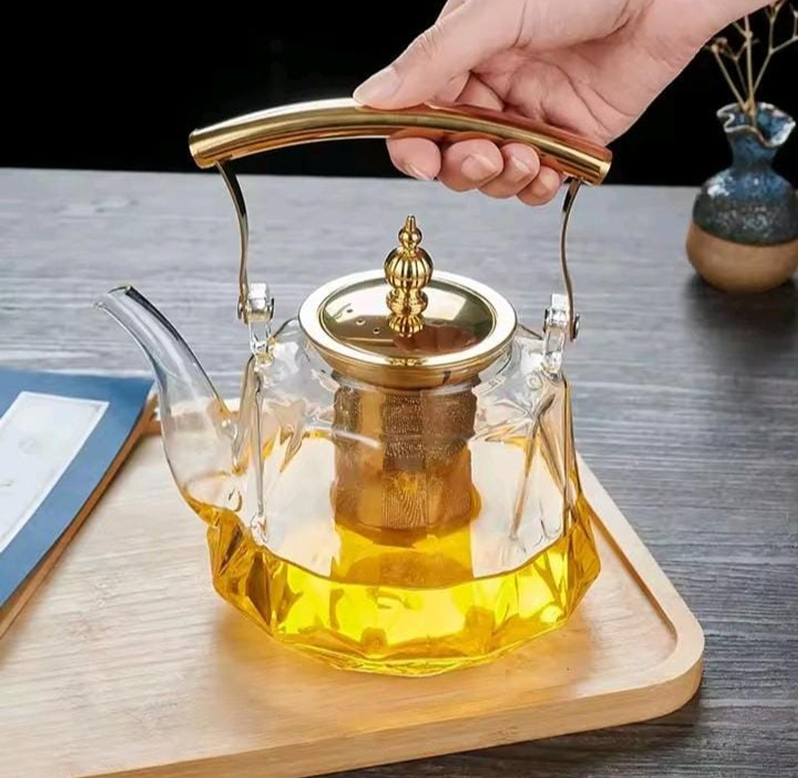 Heat resistant Glass Teapot with Strainer infuser ✅ Material; Glass with gold handle plus metallic sieve ✅Capacity: 1.2 Litres