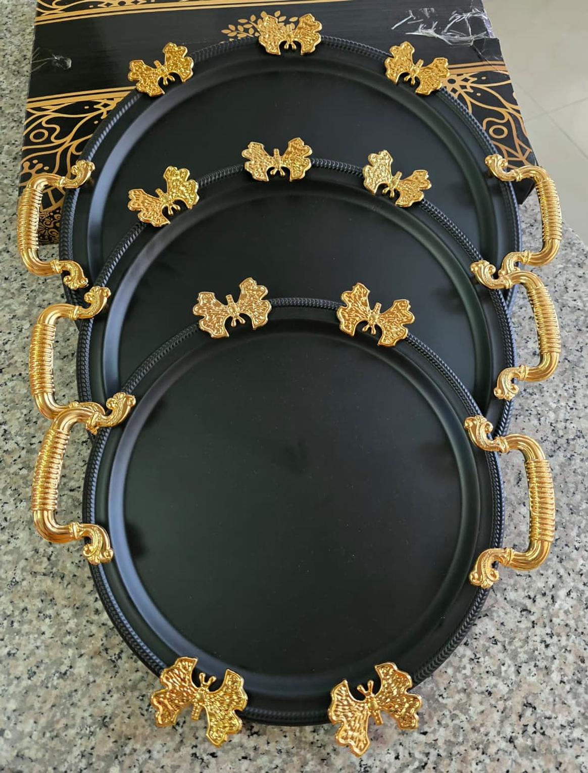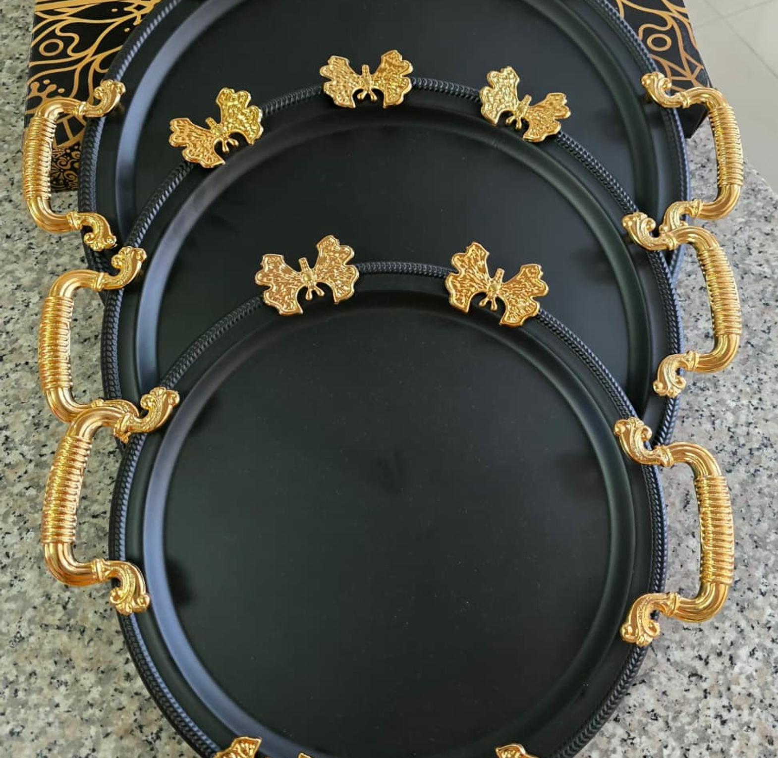 Home Decor Elegant serving Trays. ✴️ High quality 3pcs Customised stainless steel Trays with Gold Handles ✴️Mulit-purpose for Food Fruits & Snacks 💃Serve Every Meal in style.