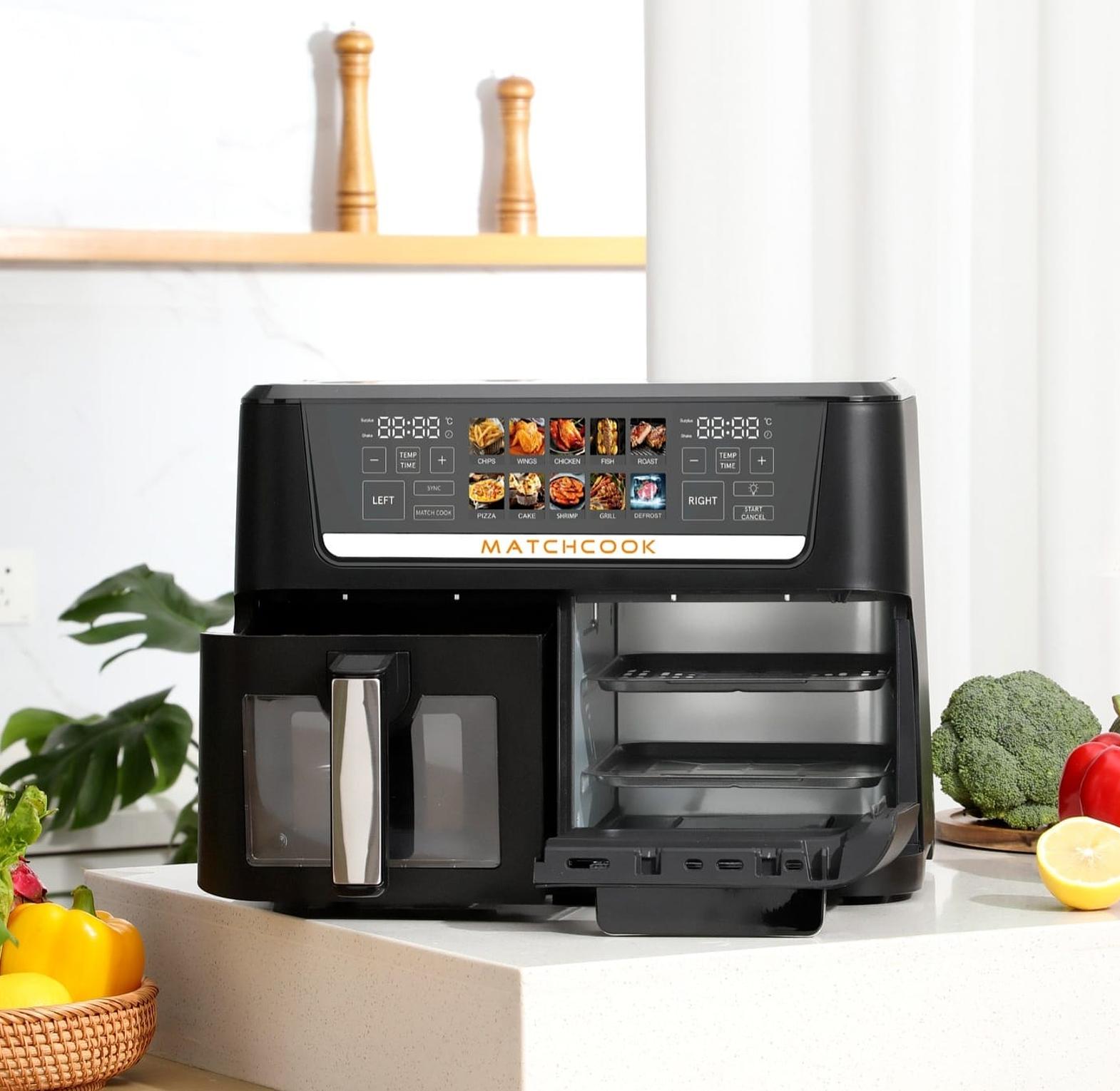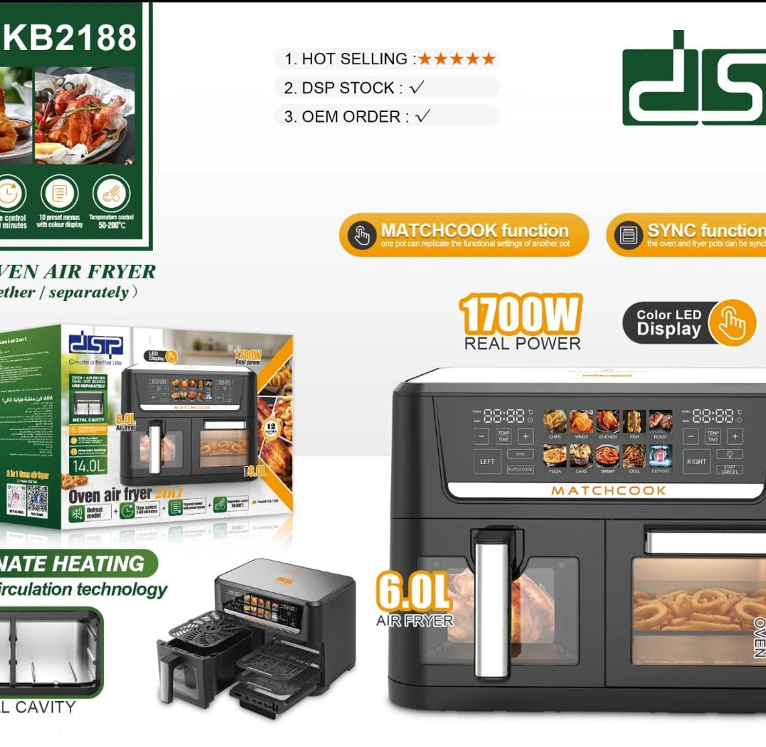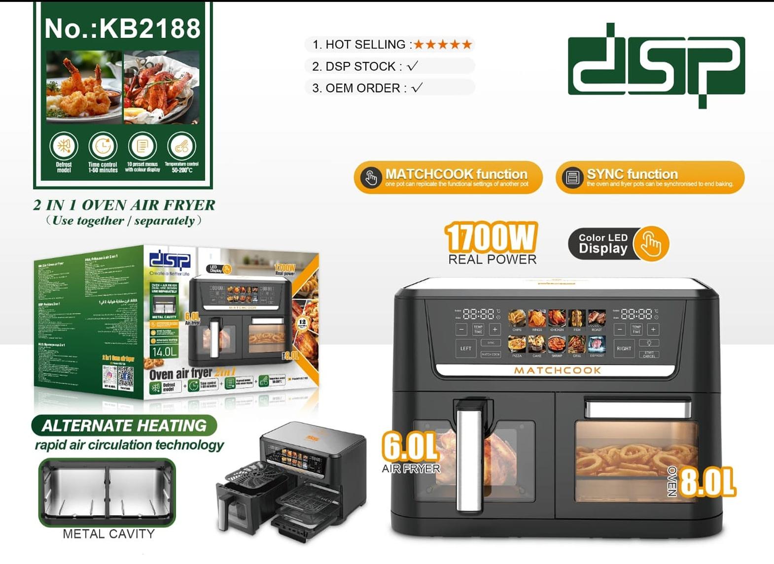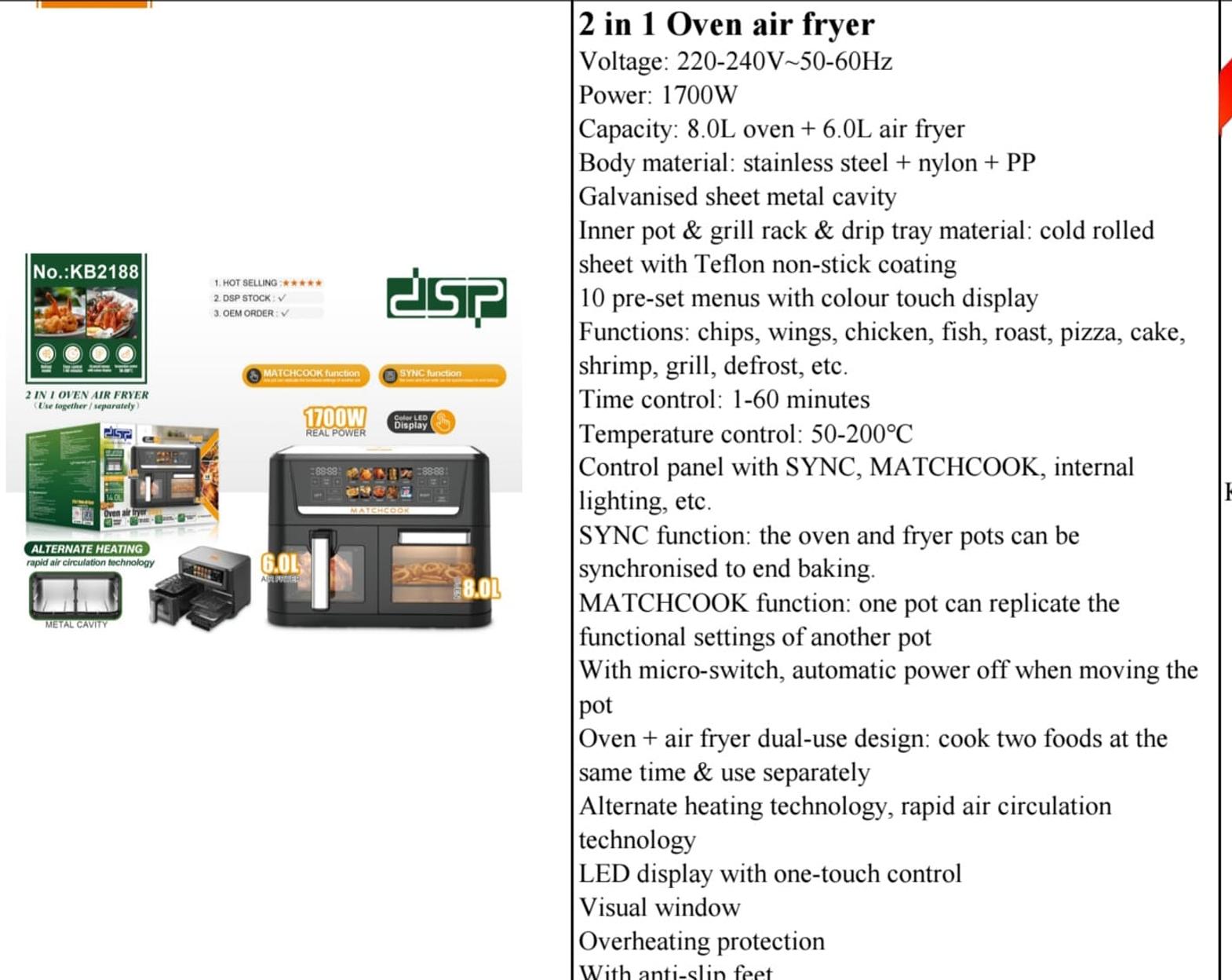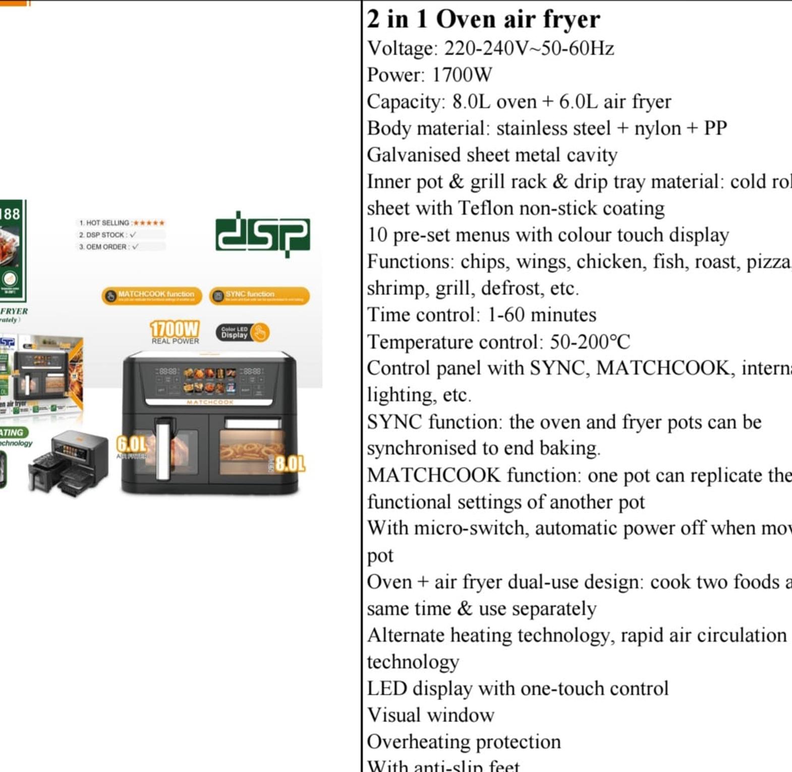 Oven + Air Fryer Combo ✴️ 2 in 1 Oven Airfryer..Maximize Space,Maximize flavour. ❇️Capacity: 8.0L Oven + 6 Ltrs Airfryer ✴️Oven + Airfryer dual use design; Cook food at the same time & use separately. ✴️Alternative heating technology ⏺️SYNC- Synchronises Oven & Fryer pots to finish together ⏺️Matchcook- One pot replicates the other settings ❇️Overheating protection with anti-slip feet